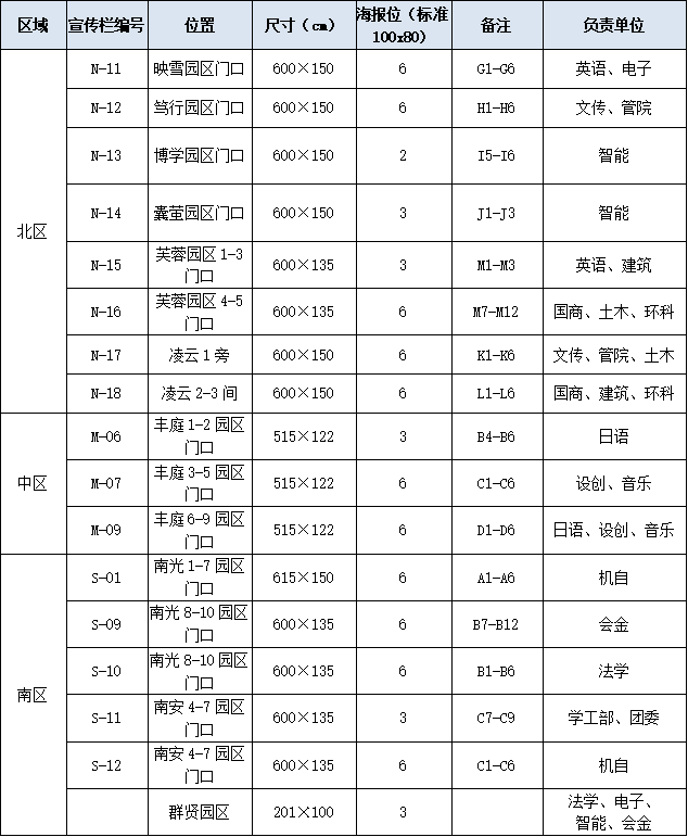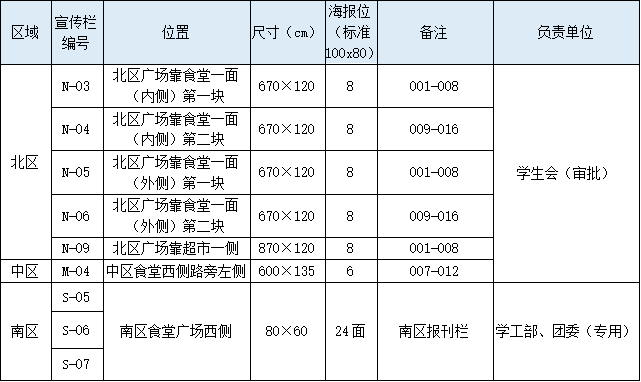 1.学工部、团委所属的公共宣传空间中,南区S-05、S-06、S-07报刊栏为学工部、团委专用区域,由学工部、团委制作海报、定期更新。