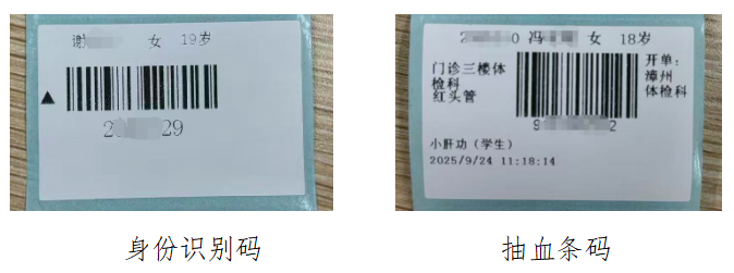 抽血条码在抽血时交给医生,身份识别码需全流程使用,请妥善保管,体检当天可以直接粘贴在手上,所有体检项目做完自行带走。